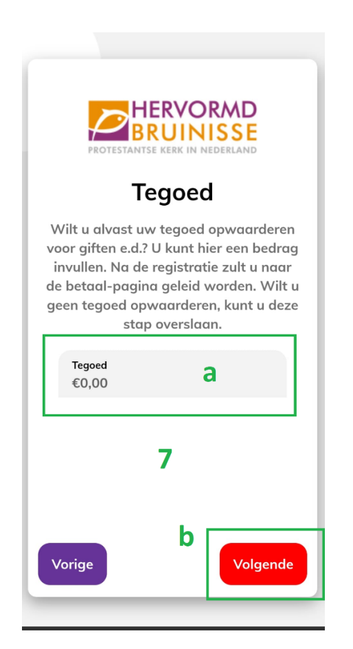 - (a) Wanneer u dit op 0 laat staan gaat u bij het drukken op volgende direct door naar de app, wanneer u hier een bedrag invult wordt u doorgestuurd naar het tegoed scherm. (zie “Opladen tegoed”)