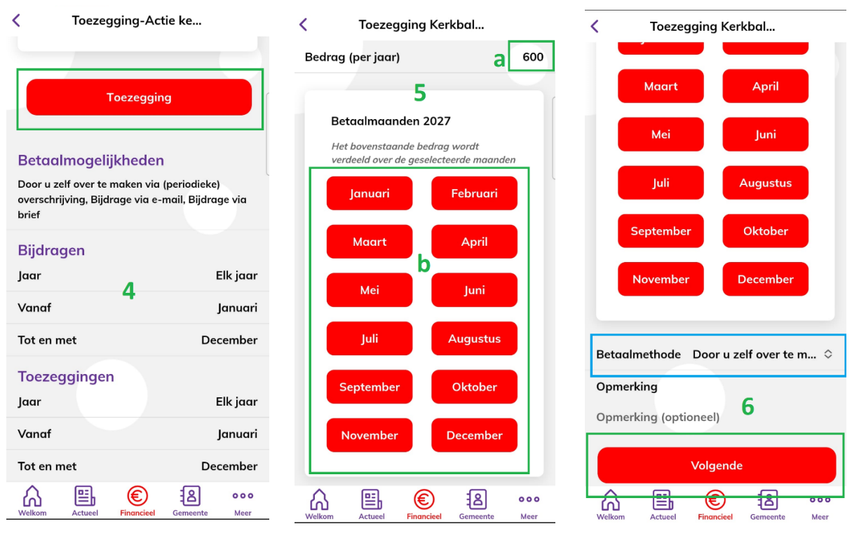Voordat u een toezegging kunt doen dient uw gemeentelidnummer/registratienummer gekoppeld te zijn aan de Appostel app. Mocht dit niet het geval zijn dan krijgt u een foutmelding. Bij “Toevoegen registratienummer” kunt u vinden hoe u deze kunt toevoegen. Voor het doen van de toezegging voor de actie kerkbalans volgt u de volgende stappen.