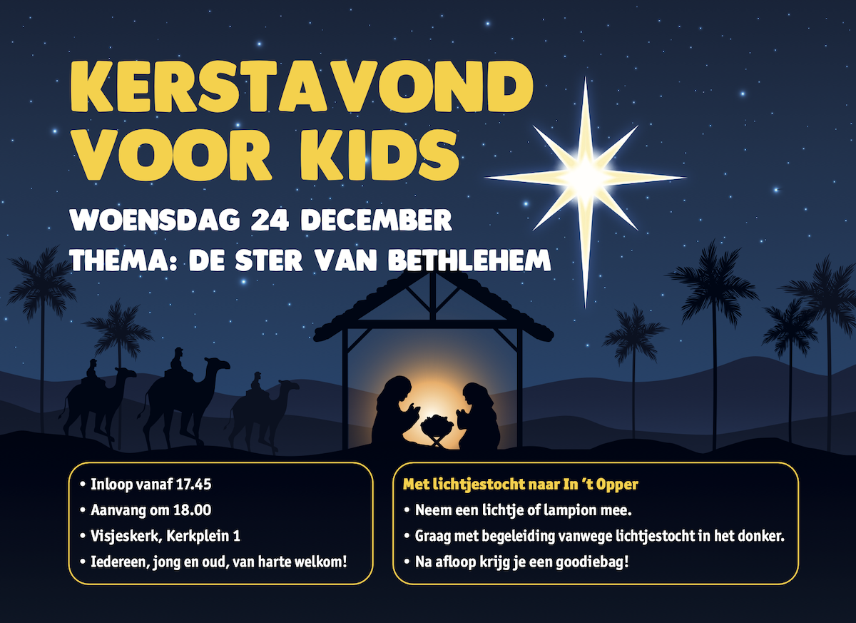![]() Op woensdag 24 december, kerstavond, is er om 18:00 uur een kerstfeestviering speciaal voor kids. We zingen liedjes, luisteren naar een verhaal, en gaan met een lichtjestoer naar In 't Opper om ook daar liederen te zingen. Ga je mee? | ||